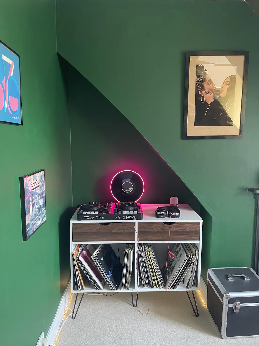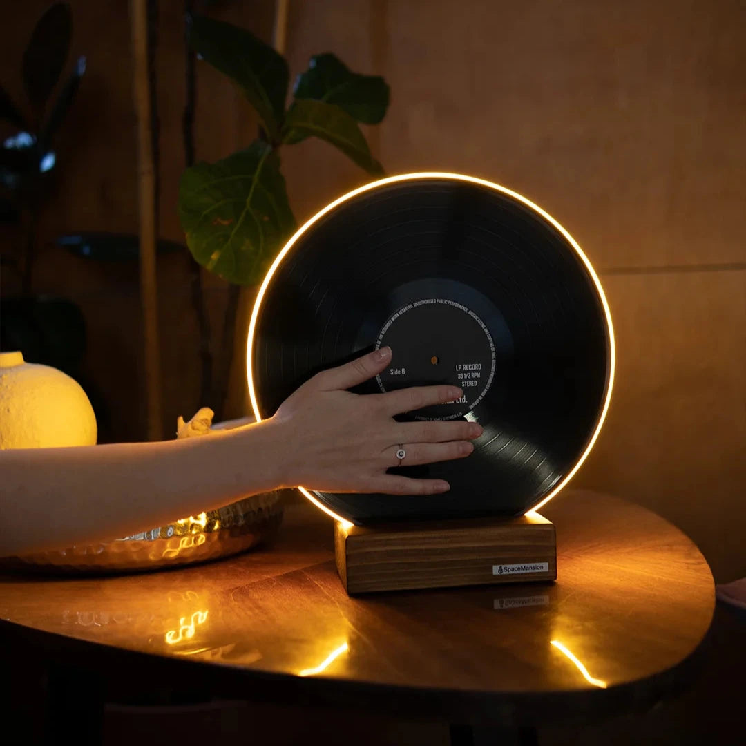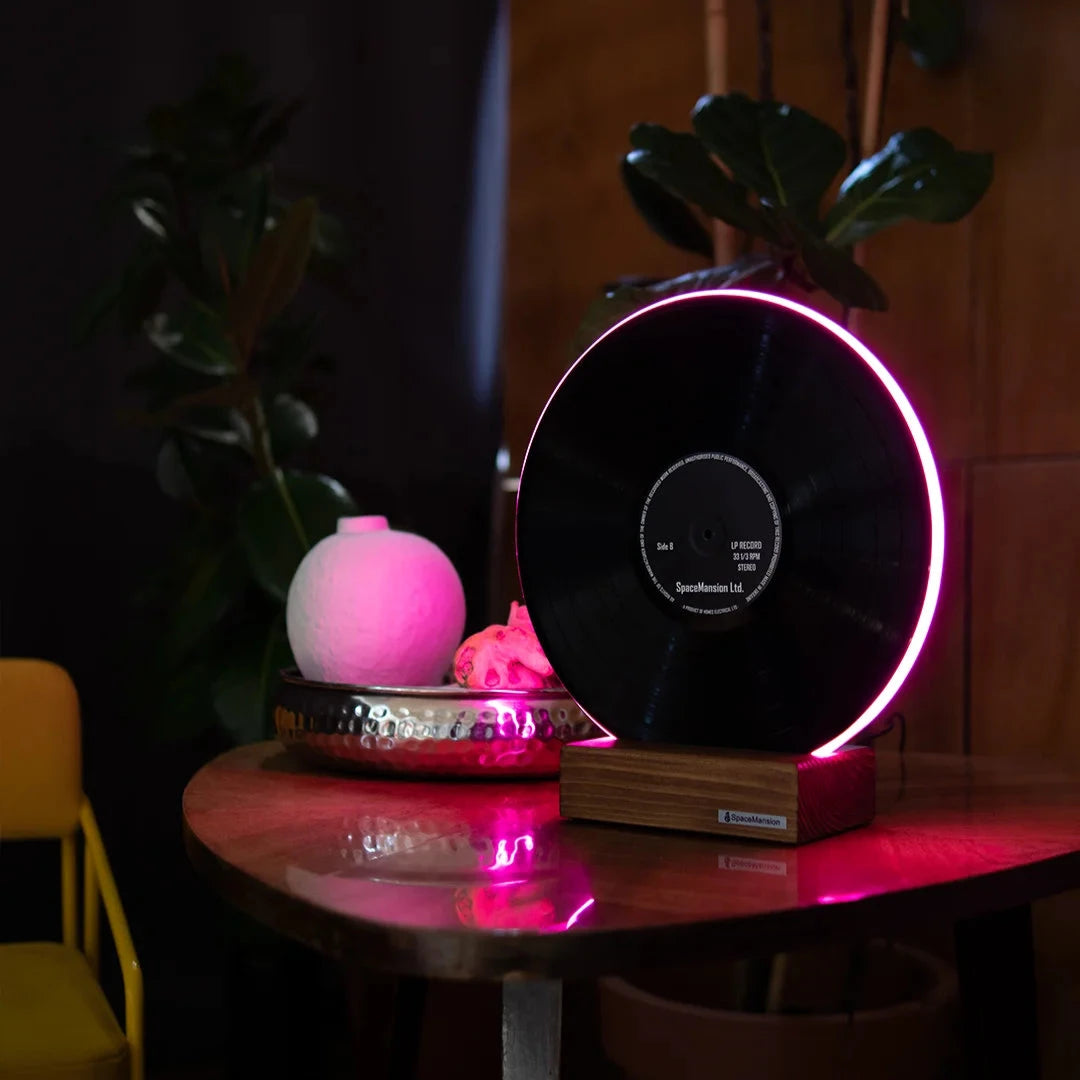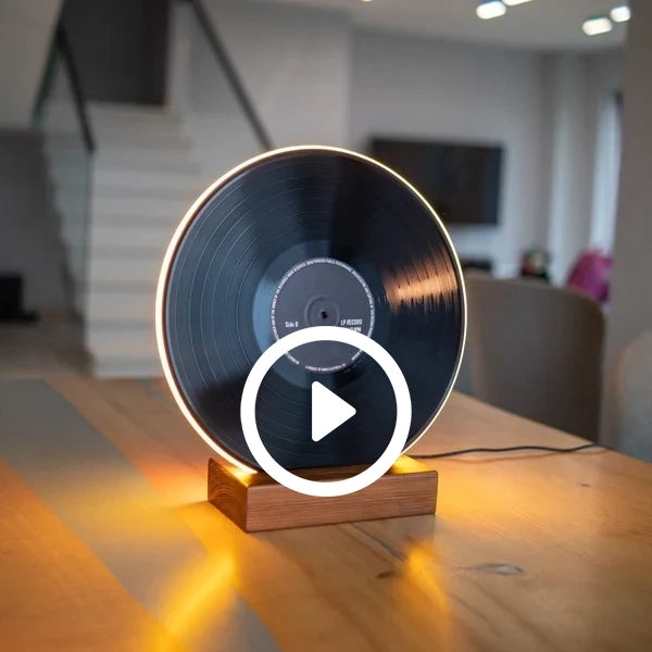 At the heart of this unique lamp are two authentic vinyl records, separated by a flexible neon light that adds a modern glow.