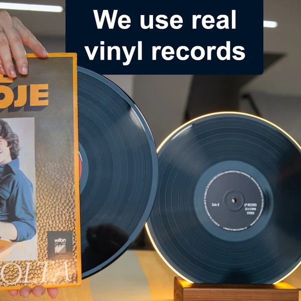 See the production process of our handmade vinyl lamp. Everything starts with selecting the perfect wooden plank for the base and two ideal vinyl records.